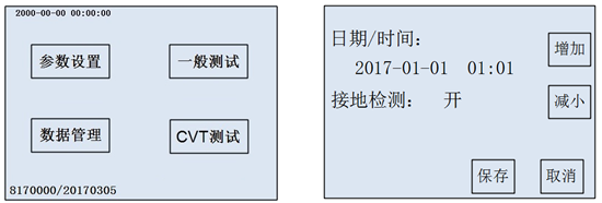 時間設(shè)置:打開儀器后直接點(diǎn)擊“參數(shù)設(shè)置”(如圖5-11)進(jìn)入時間設(shè)置界面。進(jìn)入時間菜單(如圖5-11)后,點(diǎn)擊想要修改的時間數(shù)據(jù)項目上,然后再按增加、減小鍵調(diào)整相應(yīng)的“時” 、“分” 、“秒” ,最后點(diǎn)擊保存修改時間設(shè)置,點(diǎn)擊取消退出設(shè)置并返回主界面。