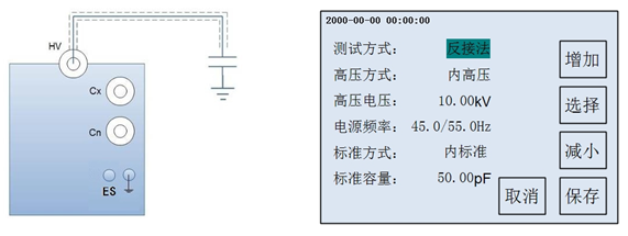 3、反接屏蔽法測(cè)量CVT上端C0的電容值和介損測(cè)量模式:反接法。電壓≤2kV