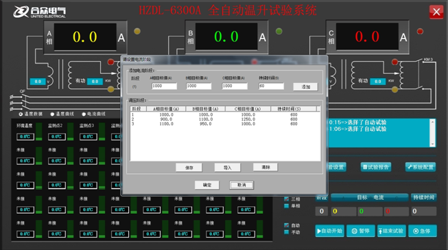 電力檢測(cè)設(shè)備有的在使用前需要設(shè)置好參數(shù),下面合眾電氣技術(shù)專家舉例介紹,全自動(dòng)溫升試驗(yàn)裝置可設(shè)置階段性試驗(yàn)。