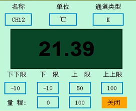 下圖為顯示畫面單個(gè)通道的具體內(nèi)容,其中包含通道名稱、單位、測(cè)量值和報(bào)警標(biāo)志四個(gè)部分。報(bào)警標(biāo)志從上到下依次為上上限報(bào)警、上限報(bào)警、下限報(bào)警、下下限報(bào)警。數(shù)值正常時(shí),報(bào)警標(biāo)志為綠色,當(dāng)超過(guò)報(bào)警值時(shí),對(duì)應(yīng)的報(bào)警標(biāo)志會(huì)由綠色變?yōu)榧t色(或者是:出現(xiàn)報(bào)警時(shí),對(duì)應(yīng)的報(bào)警標(biāo)志會(huì)由綠色變?yōu)榧t色)報(bào)警值可以在參數(shù)設(shè)置里設(shè)置。