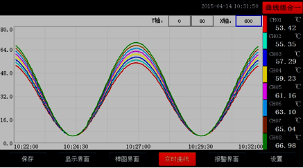當(dāng)前曲線記錄只保留單屏的顯示數(shù)據(jù),可根據(jù)觀察的需要,通過改變Y軸和時標X軸來改變顯示刷新的速度,各條曲線一致,并不影響FLASH記錄的時間間隔。