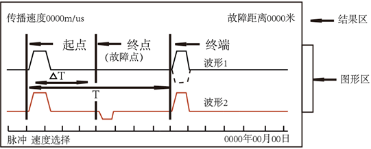電纜故障測試系統(tǒng)主界面分三個區(qū),上方為計算參數(shù)與結(jié)果區(qū),如圖9所示。中間為波形顯示(采樣前為接線圖)區(qū),根據(jù)需要可顯示一條或兩條波形。同時顯示豎線光標和時間刻度。