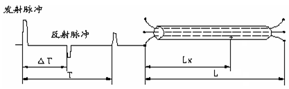 電纜故障測試系統(tǒng)測量電纜故障時,電纜可視為一條均勻分布的傳輸線,在電纜一端加脈沖電壓,則此脈沖按一定的速度(決定于電纜介質(zhì)電常數(shù)和導(dǎo)磁系數(shù))沿線傳輸,當(dāng)脈沖遇到故障點(或阻抗不均勻點)就會發(fā)生反射,用閃測儀記錄下發(fā)送脈沖和反射脈沖之間的傳輸時間△T,則可按已知的傳輸速度V來計算出故障的距離Lx,Lx=V·△T/2,如圖10所示。