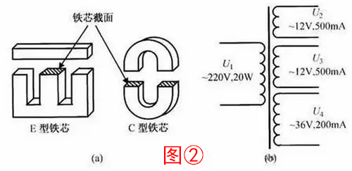 3、電源變壓器是最常用的一類變壓器。電源變壓器的主要參數(shù)是功率和次級電壓、電流。功率與鐵芯截面的平方成正比,如圖②(a)所示,鐵芯截面越大,變壓器功率越大。電源變壓器的用途是電源電壓變換,并可同時提供多種電源電壓,以適應(yīng)電子電路的需要,如圖②(b)所示。制作時應(yīng)根據(jù)需要選用具有符合要求的次級電壓、電流的變壓器。