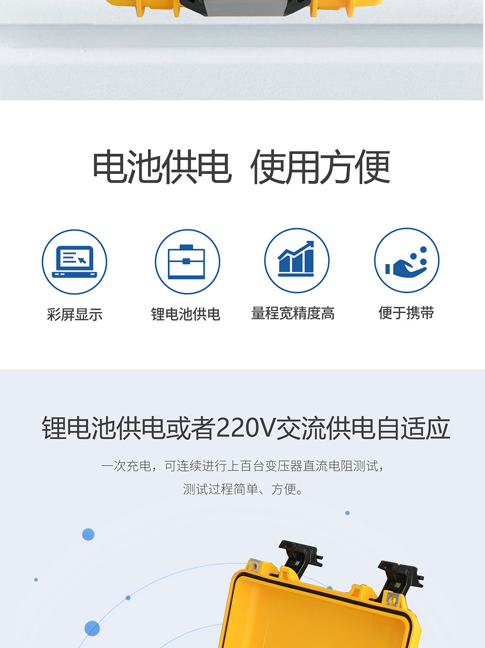 1、鋰電池供電或者220V交流供電自適應(yīng),一次充電,可連續(xù)進行上百臺變壓器直流電阻測試,測試過程簡單、方便。