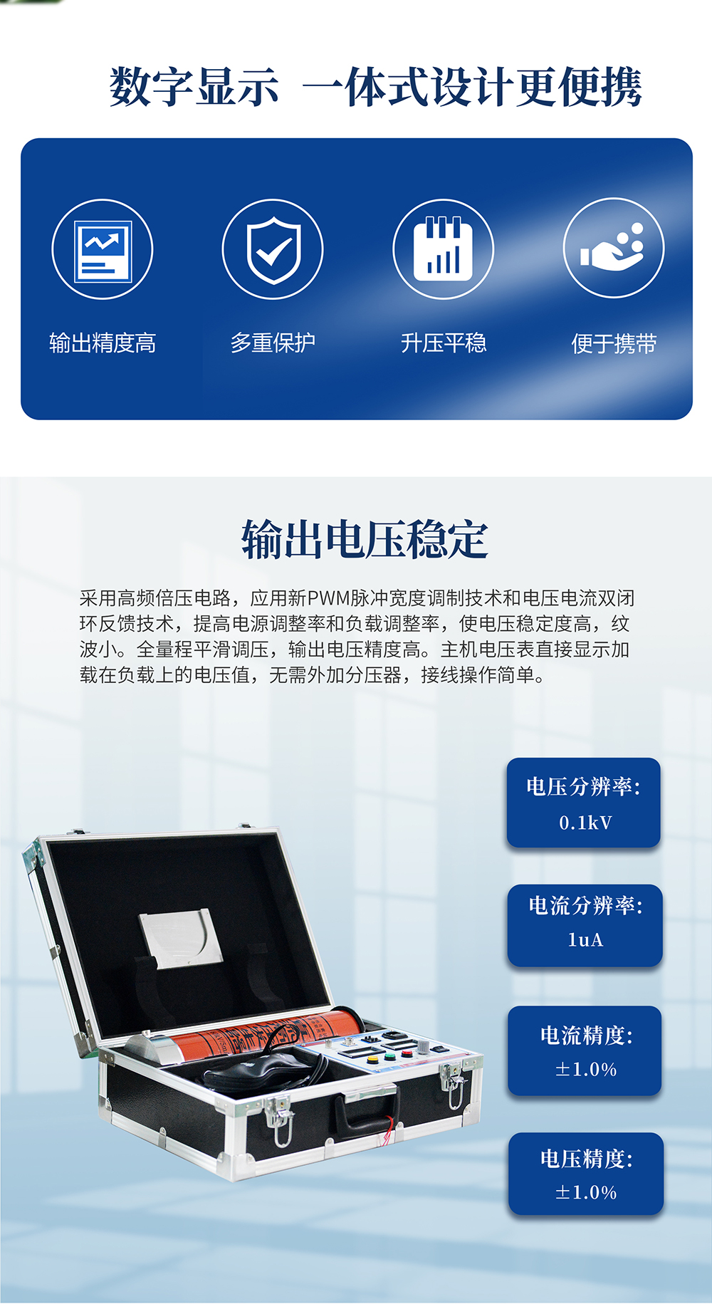 1、輸出電壓穩(wěn)定:采用高頻倍壓電路,應用新PWM脈沖寬度調(diào)制技術(shù)和電壓電流雙閉環(huán)反饋技術(shù),提高電源調(diào)整率和負載調(diào)整率,使電壓穩(wěn)定度高,紋波小。全量程平滑調(diào)壓,輸出電壓精度高。主機電壓表直接顯示加載在負載上的電壓值,無需外加分壓器,接線操作簡單。電壓分辨率0.1kV,電流分辨率1uA。