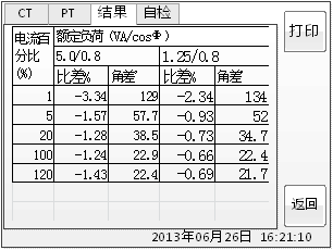 智能互感器測試儀上圖中顯示了互感器分別在額定負(fù)荷與下限負(fù)荷下的比差、角差表,額定負(fù)荷是在CT設(shè)置頁面中,下限負(fù)荷規(guī)定為25%的額定負(fù)荷。