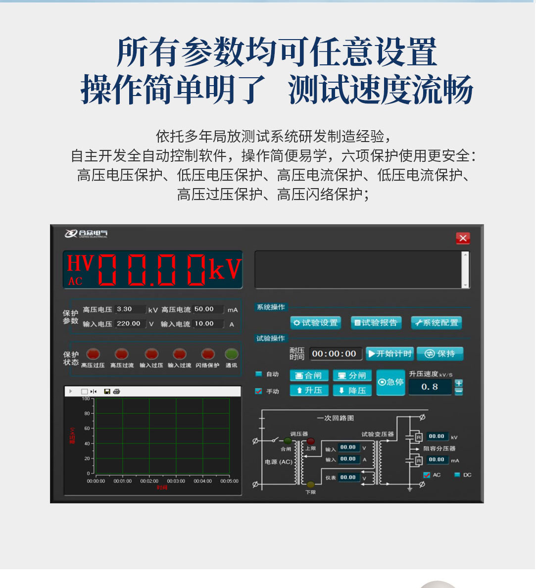 6、所有測試參數(shù)可提前進行設(shè)置,能達到高壓電壓放電擊穿電壓準確記憶、儲存、復(fù)位一系列功能;自動掃描時間設(shè)定,自動存儲電老化過程中的時間、電壓、電流等詳細記錄,方便用戶查看;