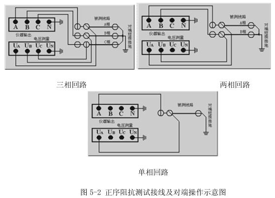 進(jìn)行正序阻抗(正序短路)測(cè)試時(shí),將對(duì)端短接接地,如圖5-2。實(shí)際測(cè)量中,由于儀器測(cè)試電源三相平衡度較高,對(duì)端完全可以接地,不會(huì)引入超過精度要求的測(cè)量誤差。這樣,可以與零序阻抗測(cè)試時(shí)的對(duì)端狀況保持一致,簡(jiǎn)化對(duì)端操作,提高工作效率。