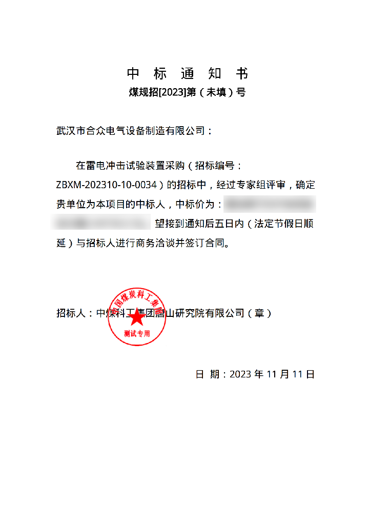 在雷電沖擊試驗(yàn)裝置采購(gòu)( 招標(biāo)編號(hào):ZBXM-202310-10-0034 ) 的招標(biāo)中,經(jīng)過(guò)專家組評(píng)審,確定貴單位為本項(xiàng)目的中標(biāo)人。望接到通知后五日內(nèi)(法定節(jié)假日順延)與招標(biāo)人進(jìn)行商務(wù)洽談并簽訂合同。